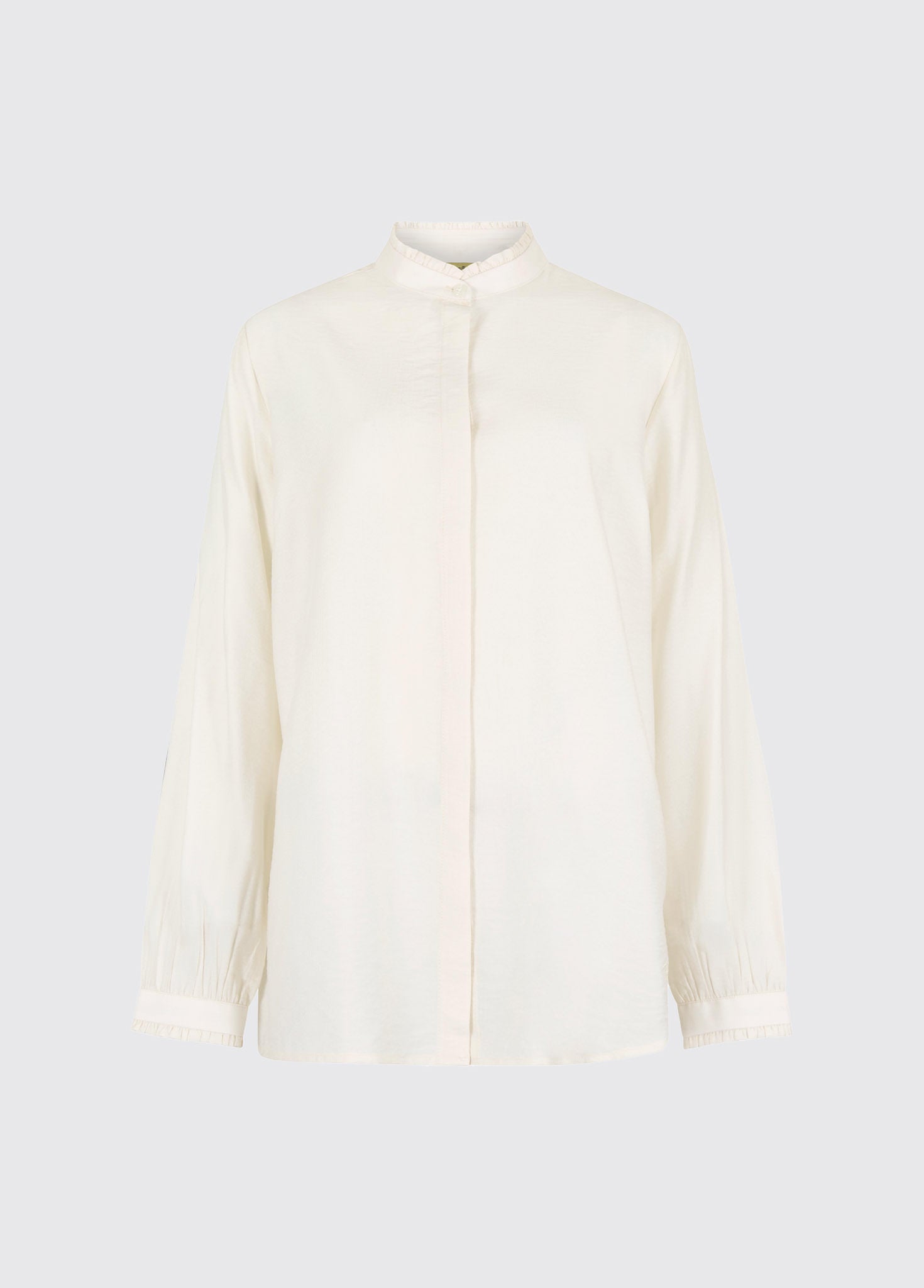 Ce chemisier merveilleusement léger, avec un col et des poignets délicatement volantés, apportera une véritable touche de sophistication à votre tenue. Sa coupe plus longue et son tissu en mélange de rayonne permettent de flatter la plupart des morphologies, et il peut se porter aussi bien rentré que lâché grâce à sa légèreté. Superbe sous une veste tailleur, il attire tout autant le regard associé à un tricot.