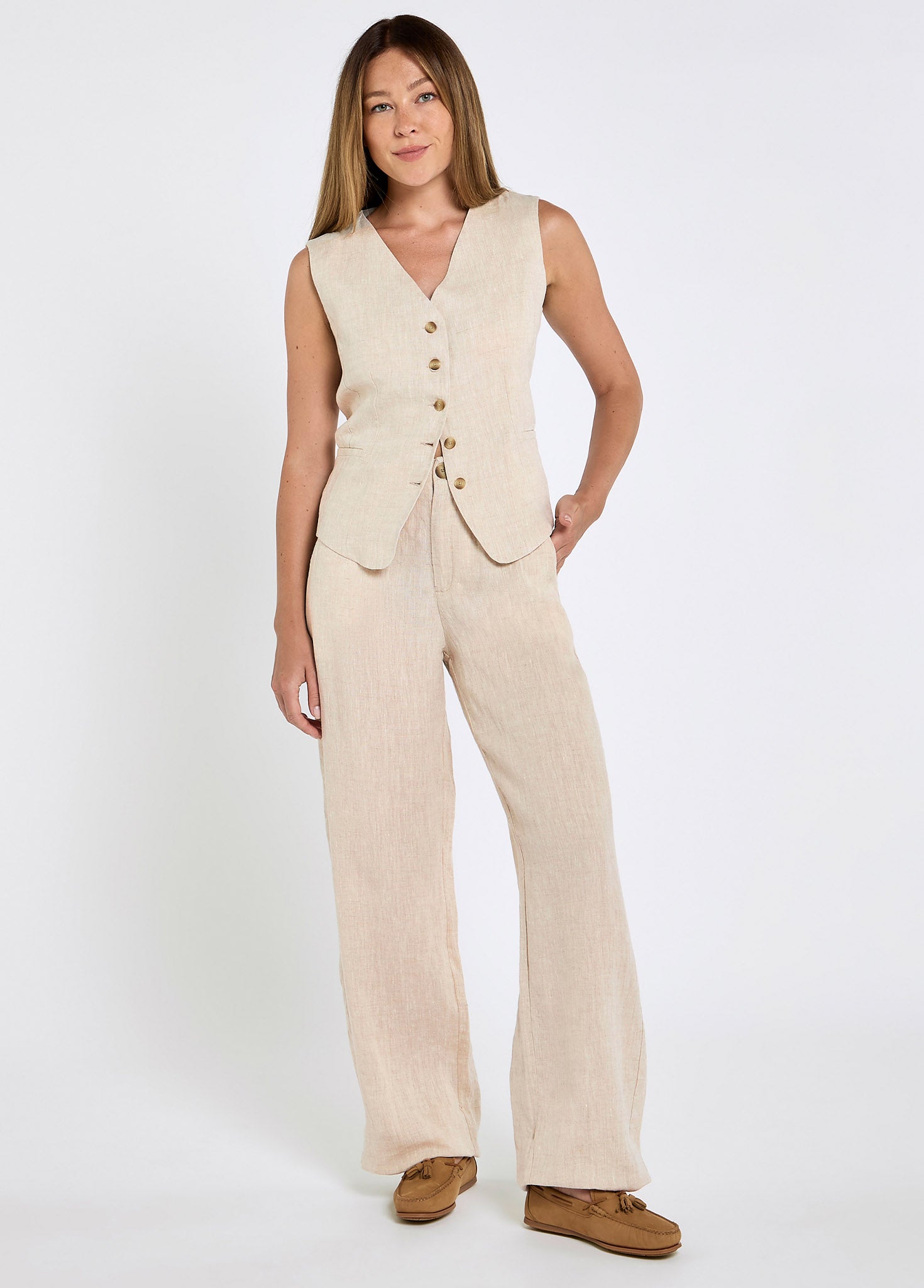 Rehaussez instantanément votre style avec le gilet Killaloe. Cette pièce polyvalente et ajustée est confectionnée en 100 % lin européen et se porte aussi bien sous une veste Avonlea que seule pour apporter une touche de sophistication à votre tenue. À assortir avec un pantalon ou un short pour transformer rapidement un look décontracté en tenue élégante, ou pour une transition parfaite du bureau à un verre en terrasse.